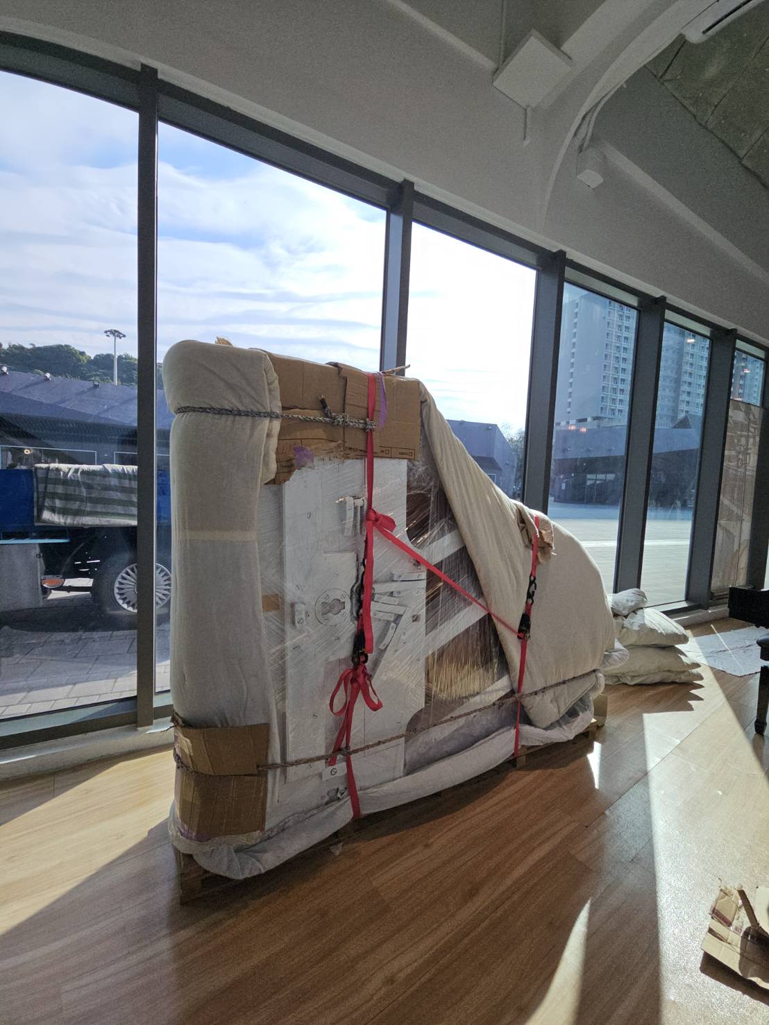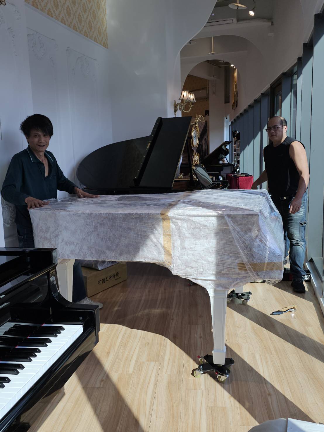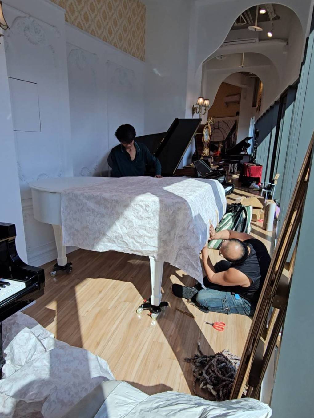 先在鋼琴表面蓋上特殊包材,並僅用無痕膠帶做必要固定,讓包材穩定、不滑動,同時避免殘膠。